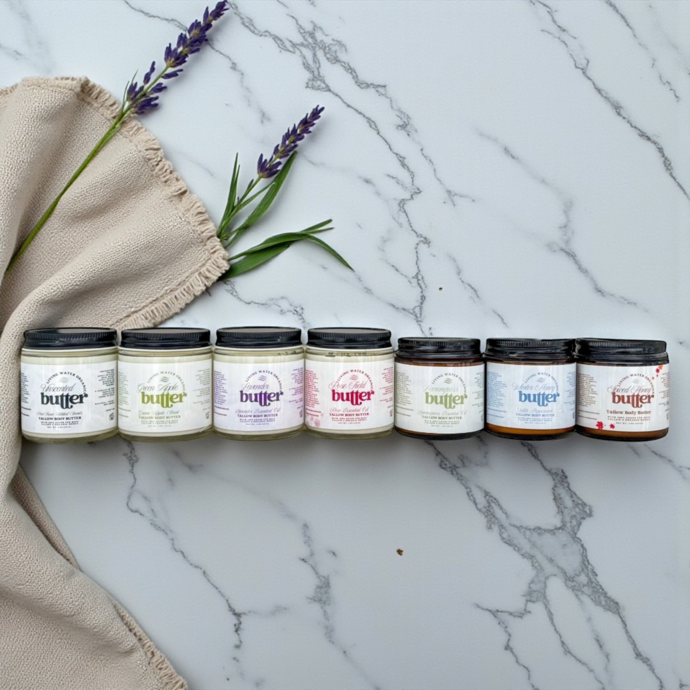 This collection of our Tallow Body Butter ranges from unscented to seasonal scent blends. Made for all skin types and formulated with 100% grass fed tallow and organic mango butter.